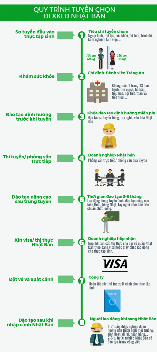 Lên công ty tìm hiểu trực tiếp về đơn hàng, sau đó đi khám sức khỏe tại bệnh viện đa khoa Tràng An. Sức khỏe đã đảm bảo, lao động sẽ nộp hồ sơ và đặt cọc thi tuyển (trúng tuyển hay không sẽ đều nhận lại số tiền đã đặt cọc)